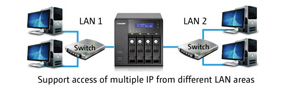 The Turbo NAS can be deployed with multiple different IP settings for sharing among different workgroups in two different subnets. |